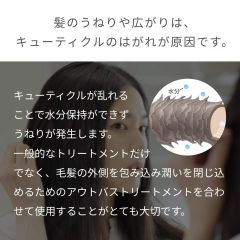 髪の表面に柔らかな被膜を形成し、キューティクルを補修することで毛髪内部の水分を留め、うねりのない、しなやかで優雅な髪に仕上げます。