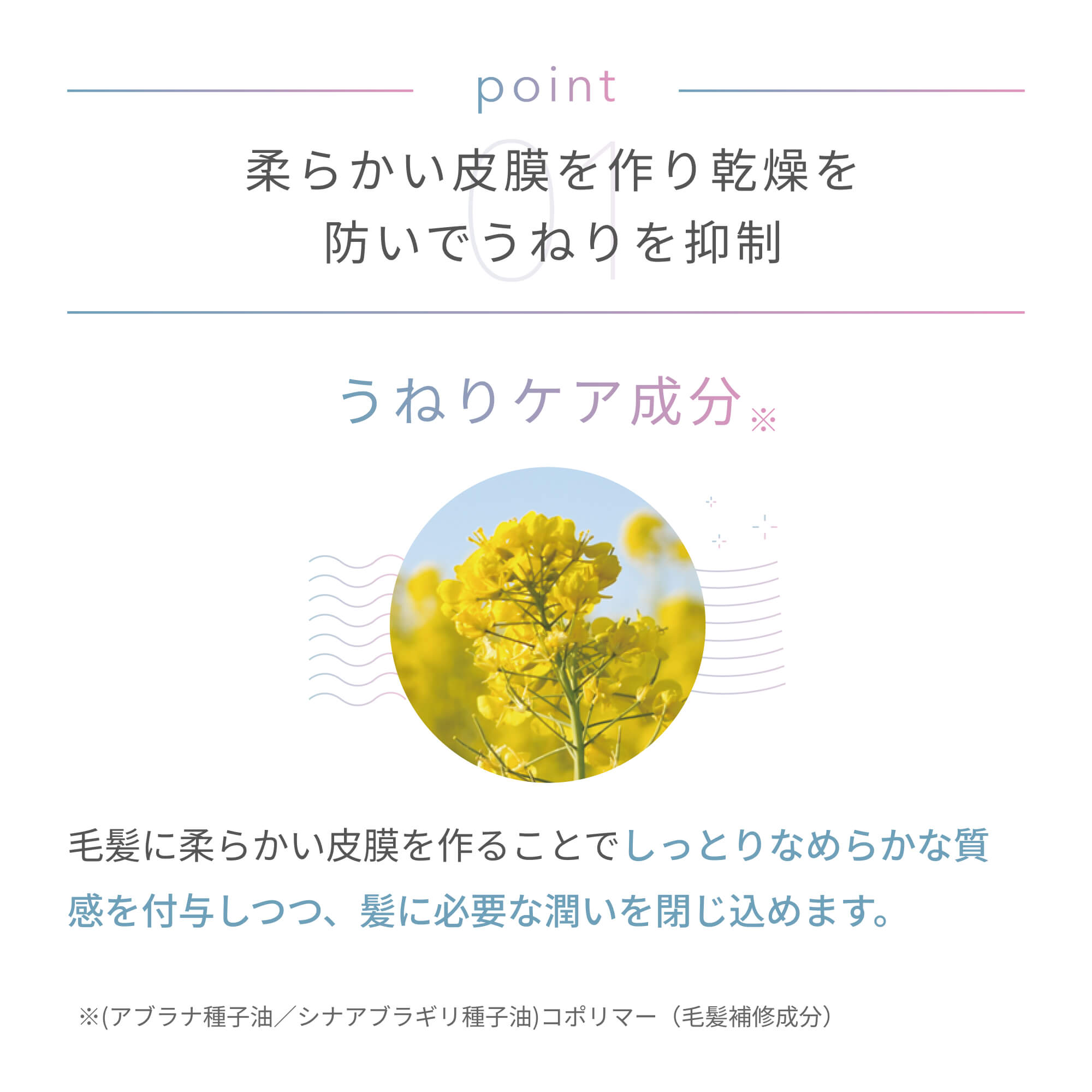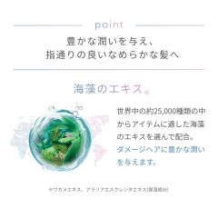 毛髪に柔らかい皮膜を作ることでしっとりなめらかな質感を付与しつつ、髪に必要な潤いを閉じ込めます。