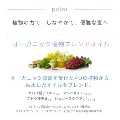 オーガニック認証を受けた4つの植物から抽出したオイルをブレンド。髪の芯まで浸透し、ダメージに負けない強さとしなやかさをもたらします。さらにキューティクルを整え、なめらかな髪へ導きます。