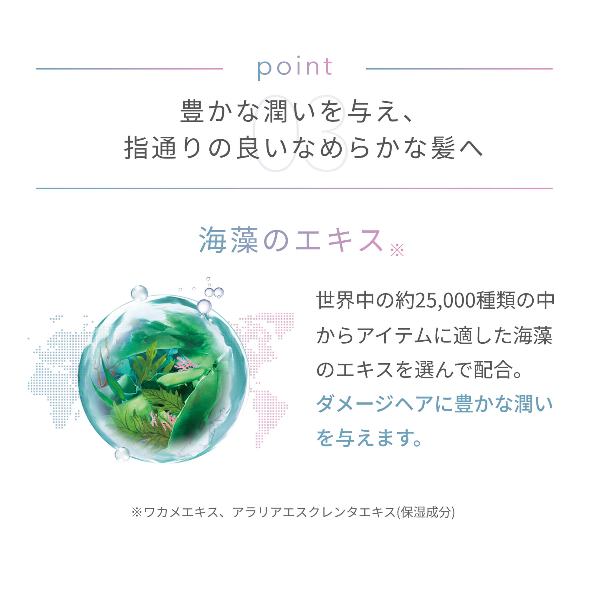 海藻のエキスを配合。海藻は浸透性が高く、自ら海中のミネラルを吸収します。それにより高濃度のミネラルやビタミン、プロテインなどの栄養素が全て海藻に含まれているのです。