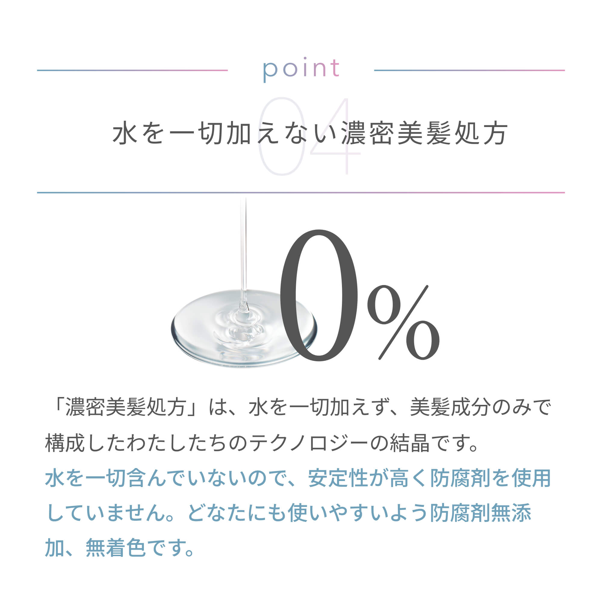 「濃密美髪処方」は、水を一切加えず、美髪成分のみで構成したわたしたちのテクノロジーの結晶です。