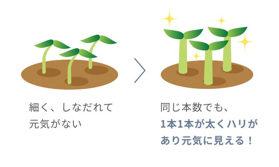 ボリュームのある髪とない髪の違いは、本数はもちろん、”太さ”と”ハリ”に違いがあります。同じ本数でも、1本1本が太く、ハリがあると、ボリュームのある若々しい髪に見えます。