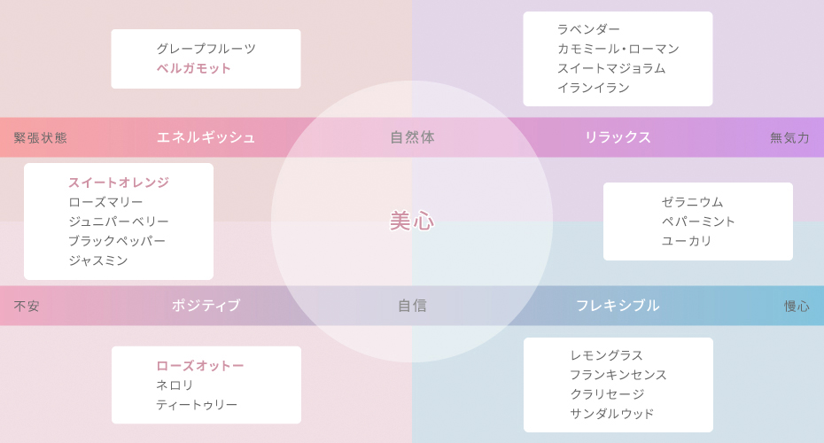 独自の香り理論に基づき「ベルガモット」・「オレンジ」・「ローズ」の天然精油をブレンド。