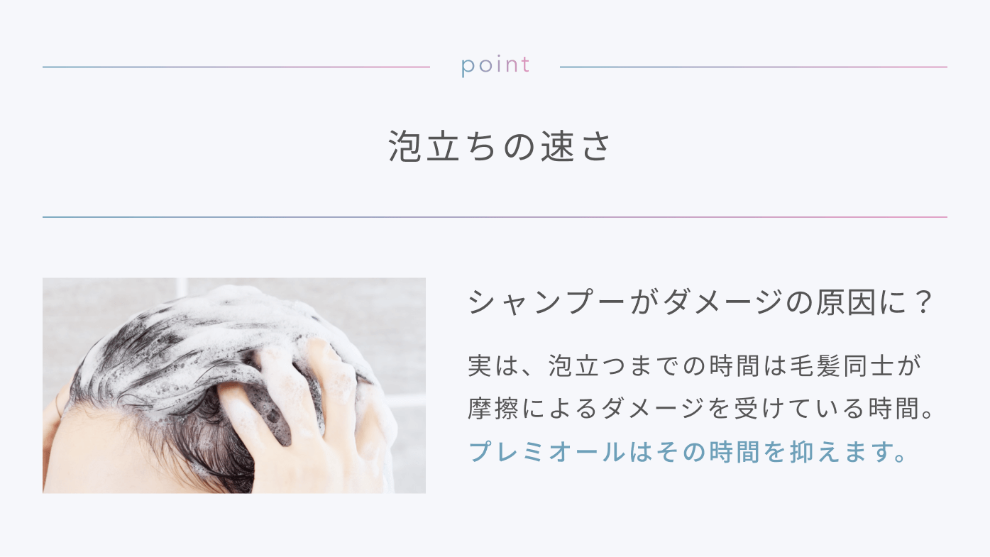 プレミオールシャンプーは泡立ちが早く、柔らかい泡が髪全体に素早く浸透するため、泡立つまでの髪同士の摩擦を抑え、ダメージを防ぎます。