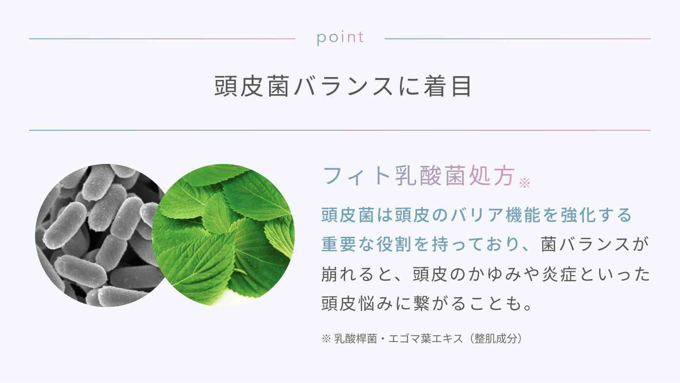 頭皮のバリア機能に大きな役割をになうのが頭皮菌。菌バランスが崩れるとかゆみなどに繋がることもあります。その頭皮菌に着目し、フィト乳酸菌処方」を採用。髪のうねりやパサつき、頭皮のベタつきやニオイの原因となる頭皮のバリア機能の乱れを整えます。