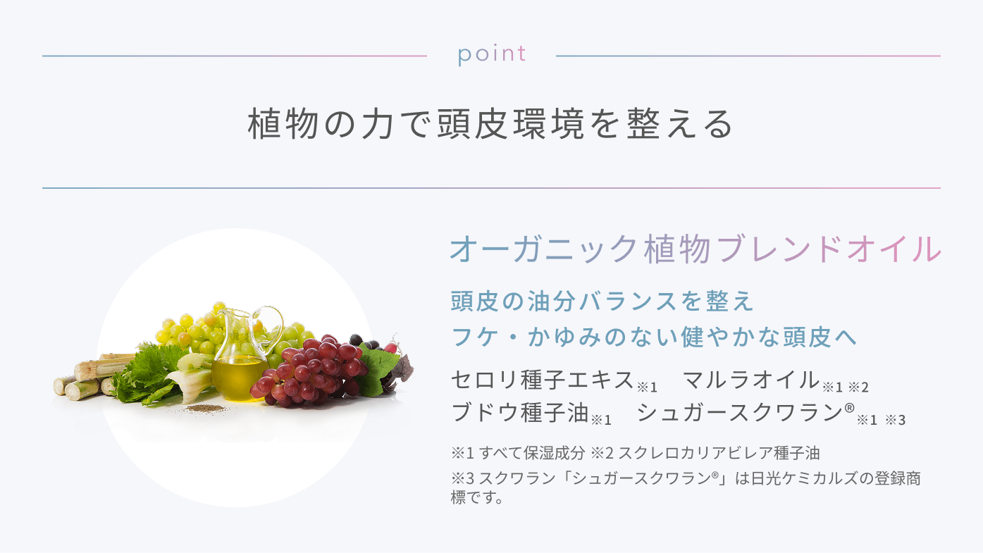4種類の植物エキスが頭皮に潤いを与え、巡りをよくするとともに、過剰な皮脂を抑え、すこやかに保ちます。