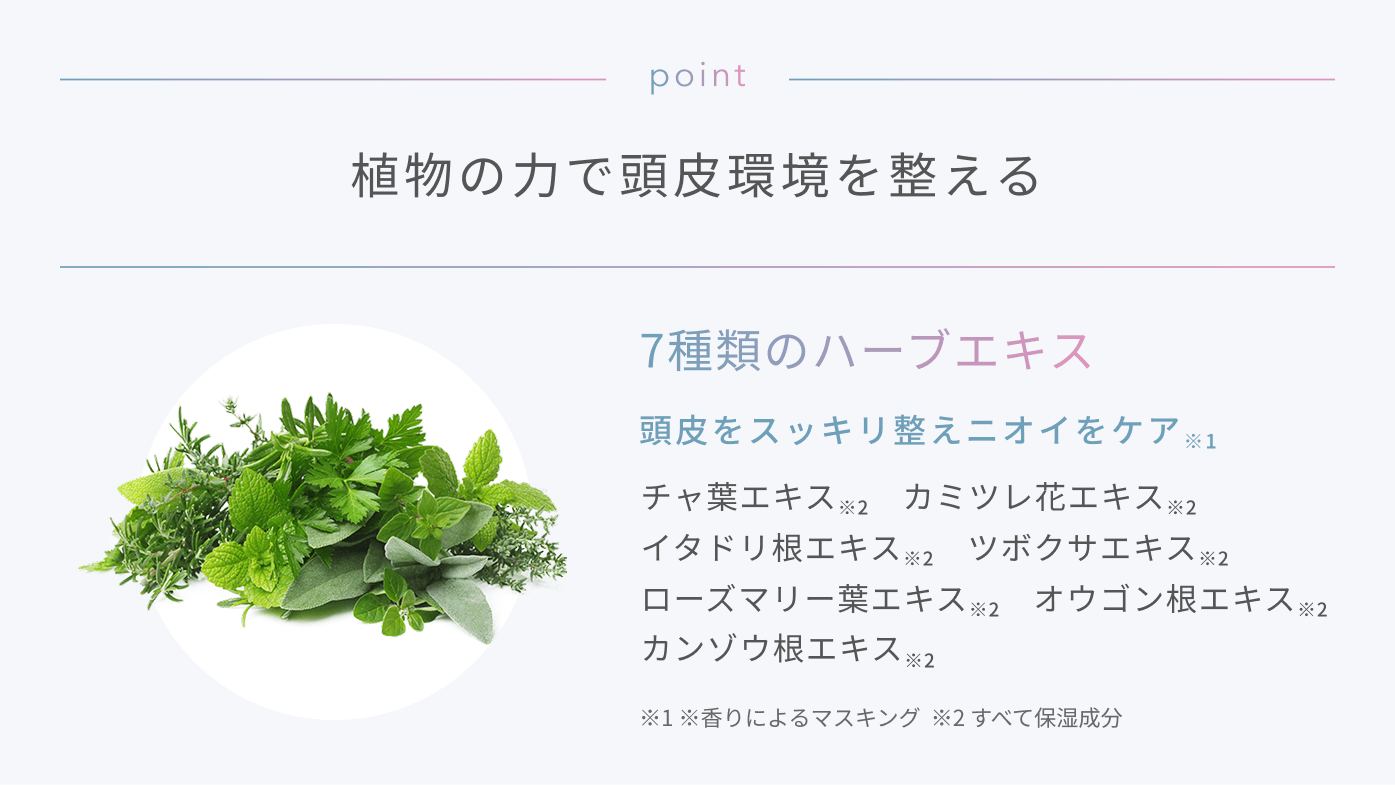 200種類の植物から厳選した7種類のハーブエキスが、頭皮を健やかで爽やかな状態に導き、頭皮の脂っぽさや気になるニオイを抑えます。