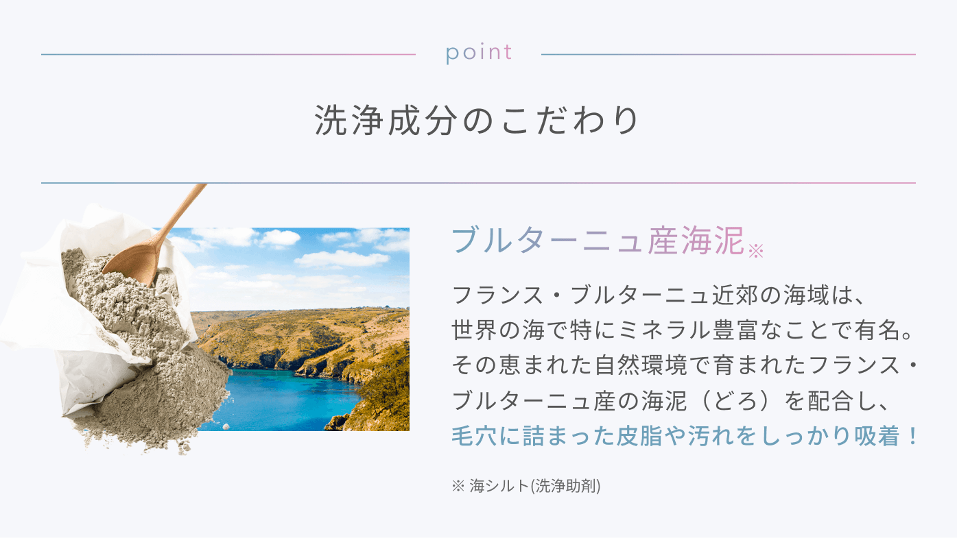 アミノ酸系シャンプーのやさしい洗浄力に加え、フランス・ブルターニュ産の海泥(マリンシルト)が毛穴の汚れを吸着してすっきり洗い上げます。