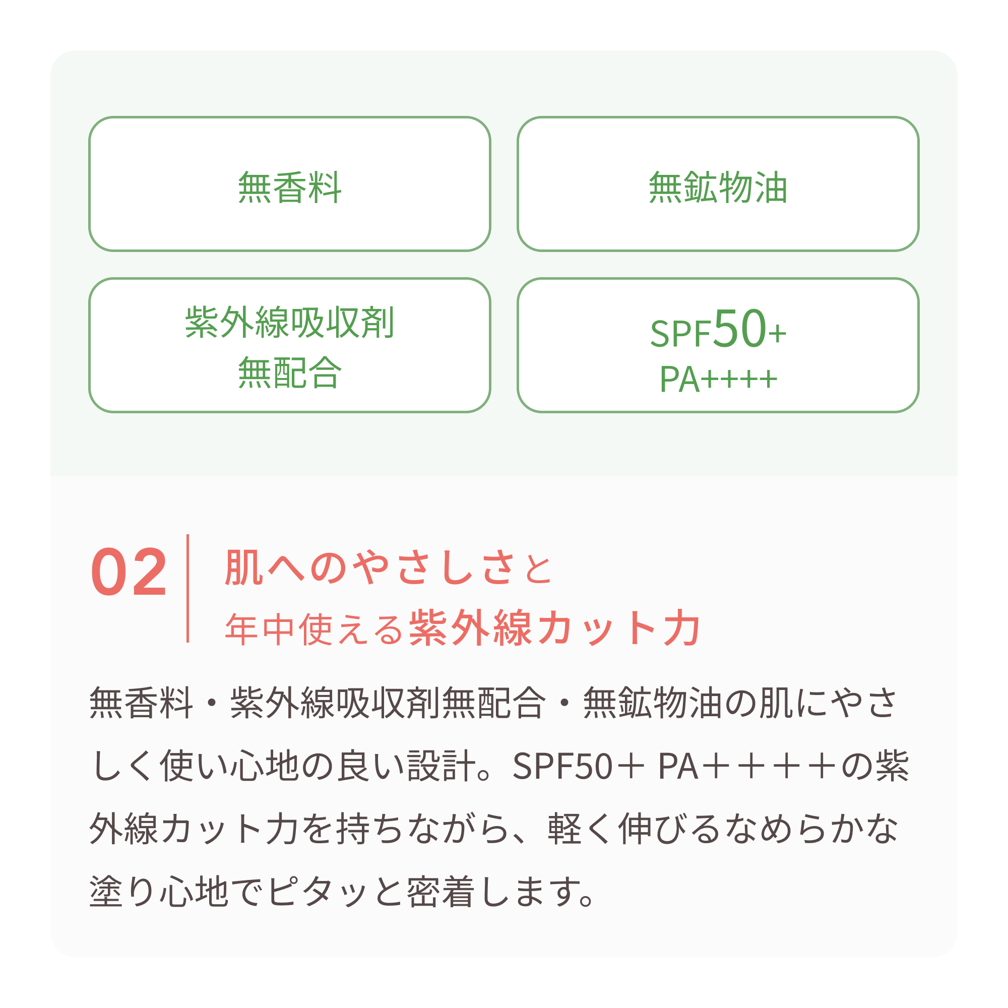 無香料・紫外線吸収剤無配合・無鉱物油の肌にやさしく使い心地の良い設計。SPF50+ PA++++の紫外線カット力を持ちながら、軽く伸びるなめらかな塗り心地でピタッと密着します。