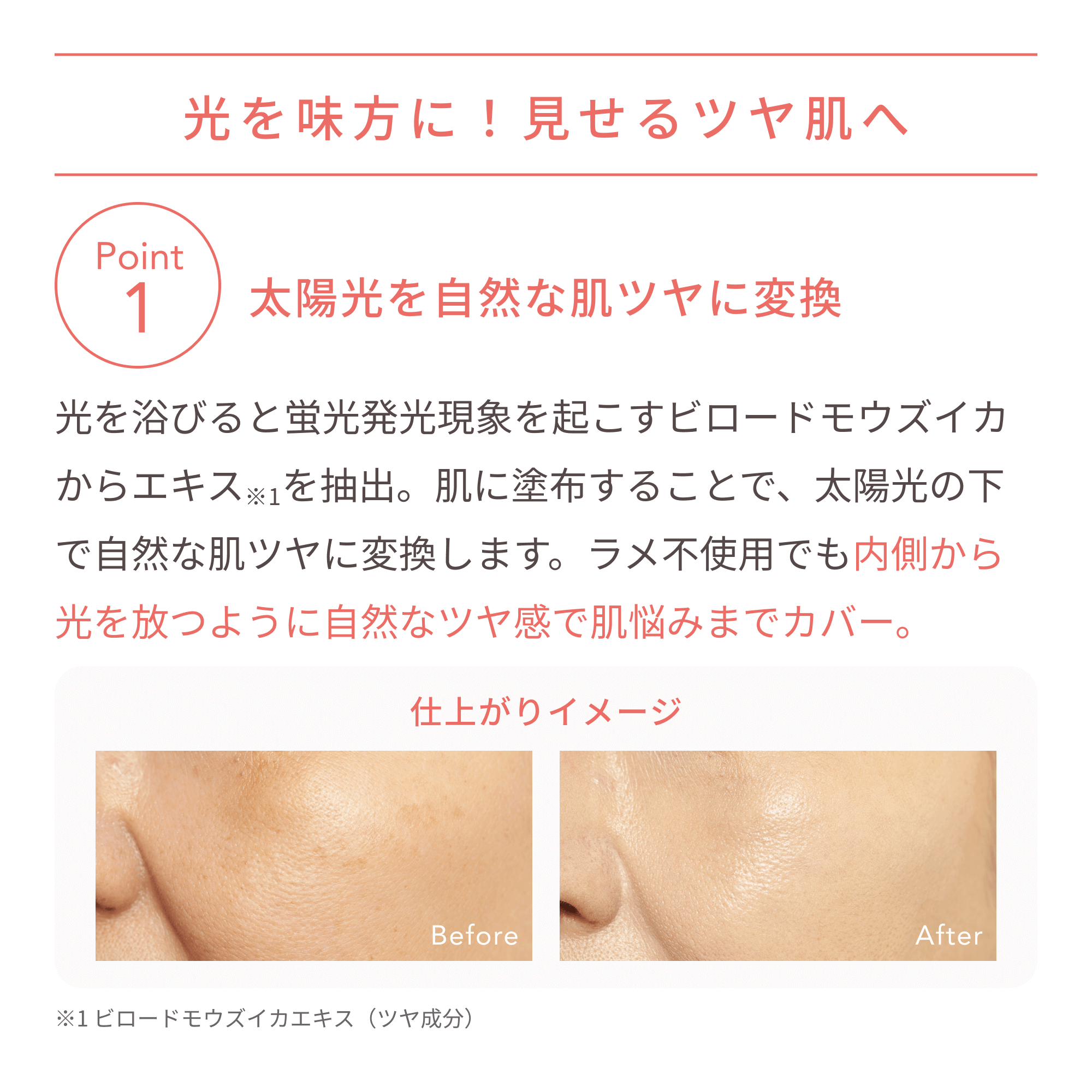 肌に塗布することで、太陽光の下で自然な肌ツヤに変換します。ラメ不使用の処方でも内側から光を放つように自然なツヤ感で肌悩みまでカバー。
