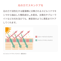 光の力で活性化する藍藻類に分類されるスピルリナマキシマから抽出した整肌成分※2を配合。太陽光やブルーライトなどの光を浴びても、美容液のように素肌までケアしてくれます。