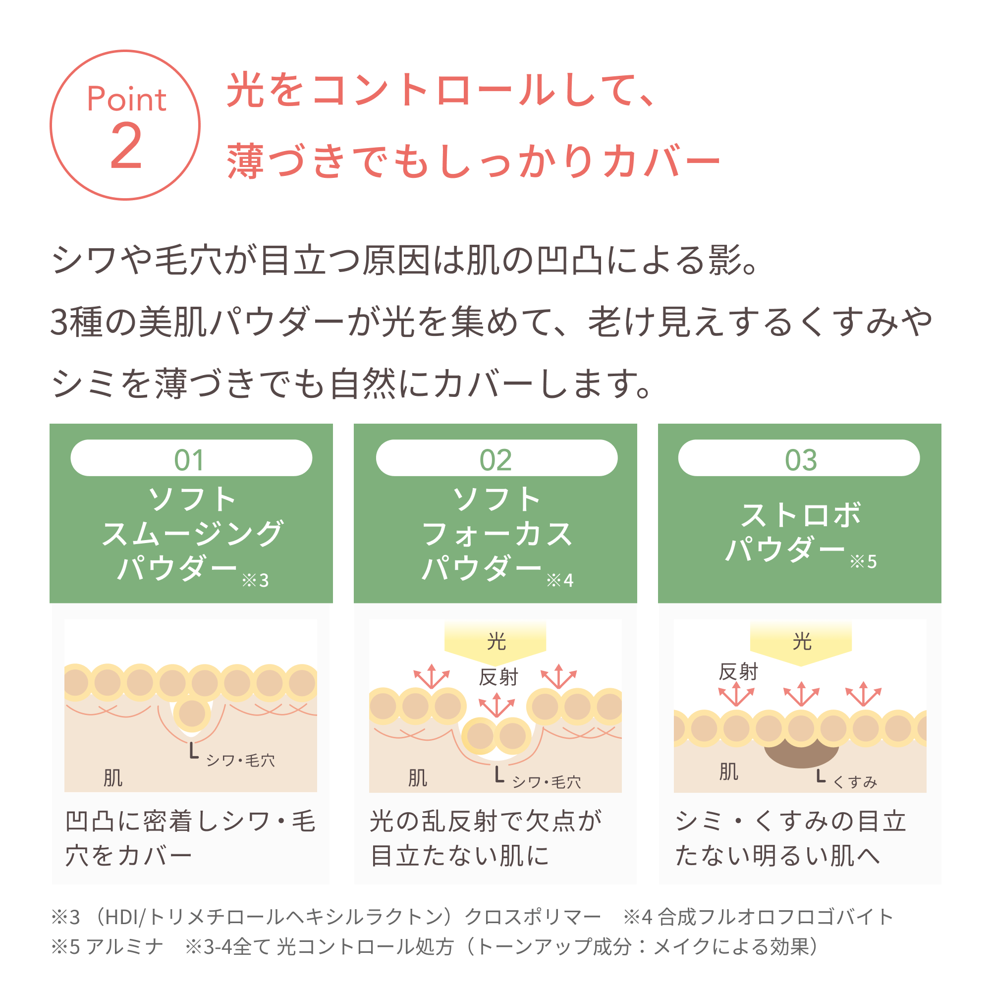 シワや毛穴が目立つ原因は肌の凹凸による影。3種の美肌パウダーが光を集めて、老け見えするくすみやシミを薄づきでも自然にカバーします。