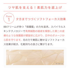 BBクリームが持つ「保護膜」の力を追求。スパイラルスキンテクノロジーで角質細胞の組成を模倣した第二の皮膚のような保護膜が螺旋状に広がり、日中のダメージから肌を守ります。夕方になっても崩れにくく光の力で美肌に魅せるソフトフォーカス効果が続き、化粧持ちの良さに繋がります。