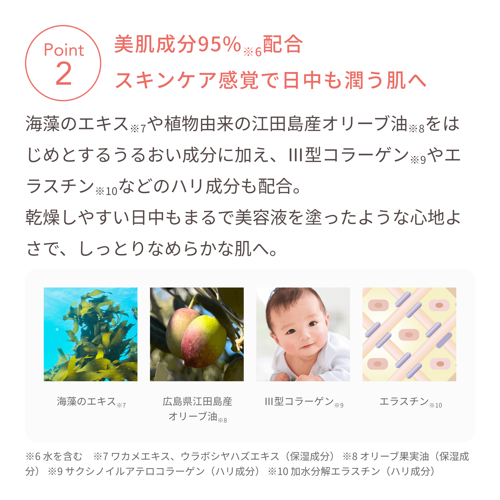 ※6 水を含む ※7 ワカメエキス、ウラボシヤハズエキス(保湿成分) ※8 オリーブ果実油(保湿成分) ※9 サクシノイルアテロコラーゲン(ハリ成分) ※10 加水分解エラスチン(ハリ成分)