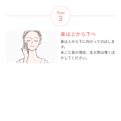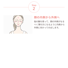 指の腹を使って、顔の外側がなるべく薄付きになるように内側から外側に向かってのばします。