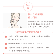 シミや毛穴、クマなど気になる箇所は、少量を重ねてポンポンと軽くおさえるようにつけてください。
