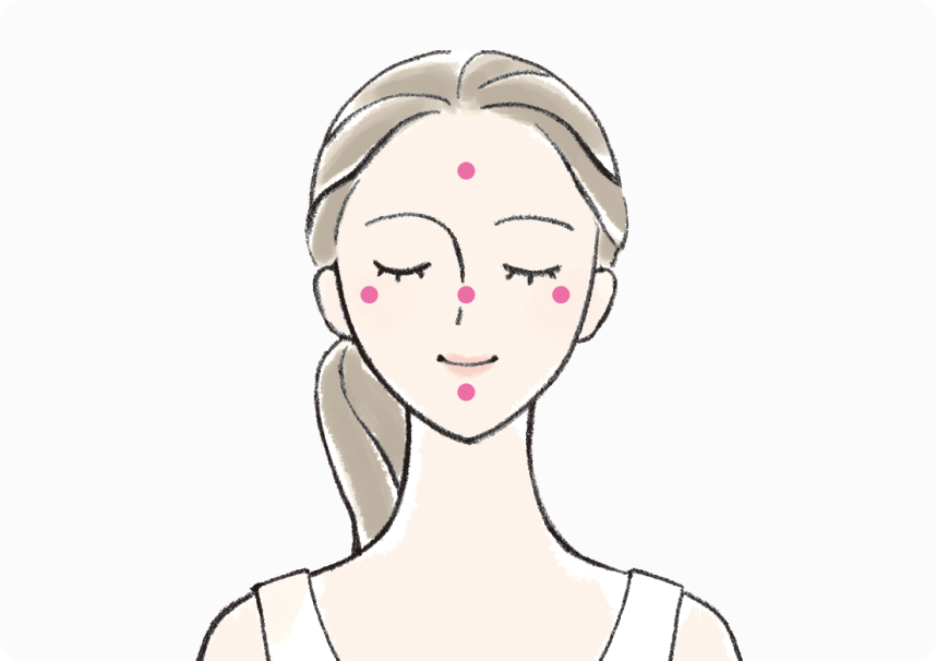 化粧水などで肌を整えた後、適量を手に取り、頬、額、鼻、あごの5ヵ所に分けてのせます。