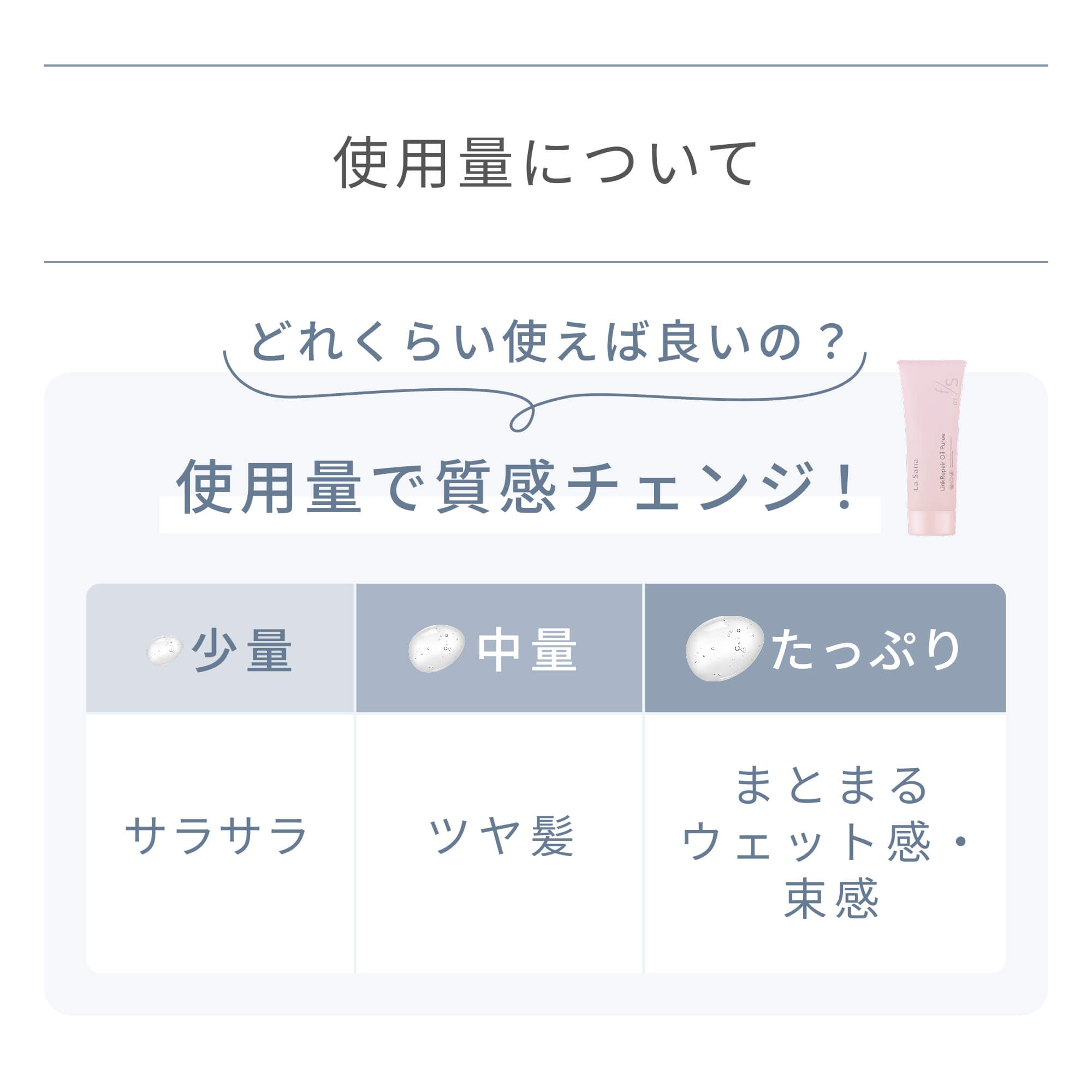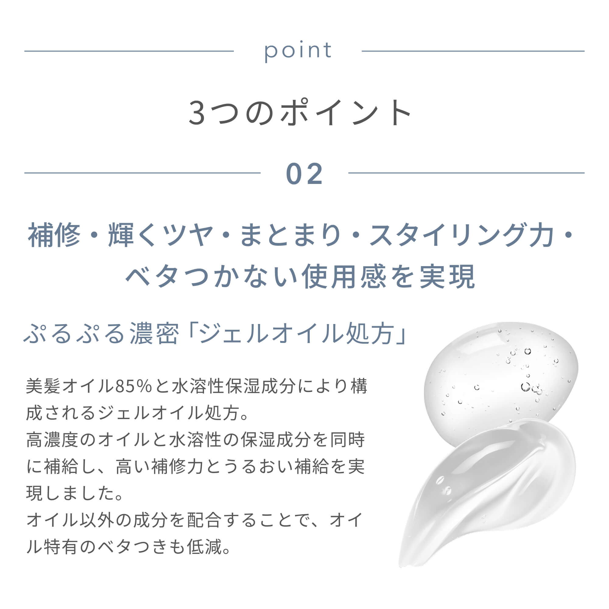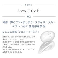 美髪オイル85%と水溶性保湿成分により構成されるジェルオイル処方。
