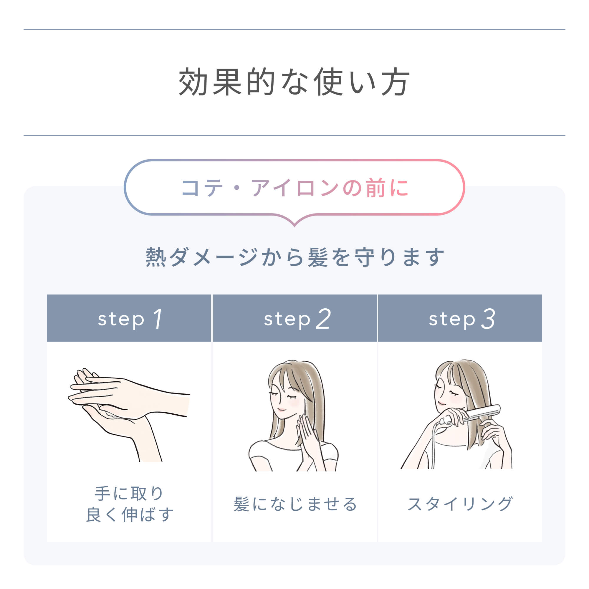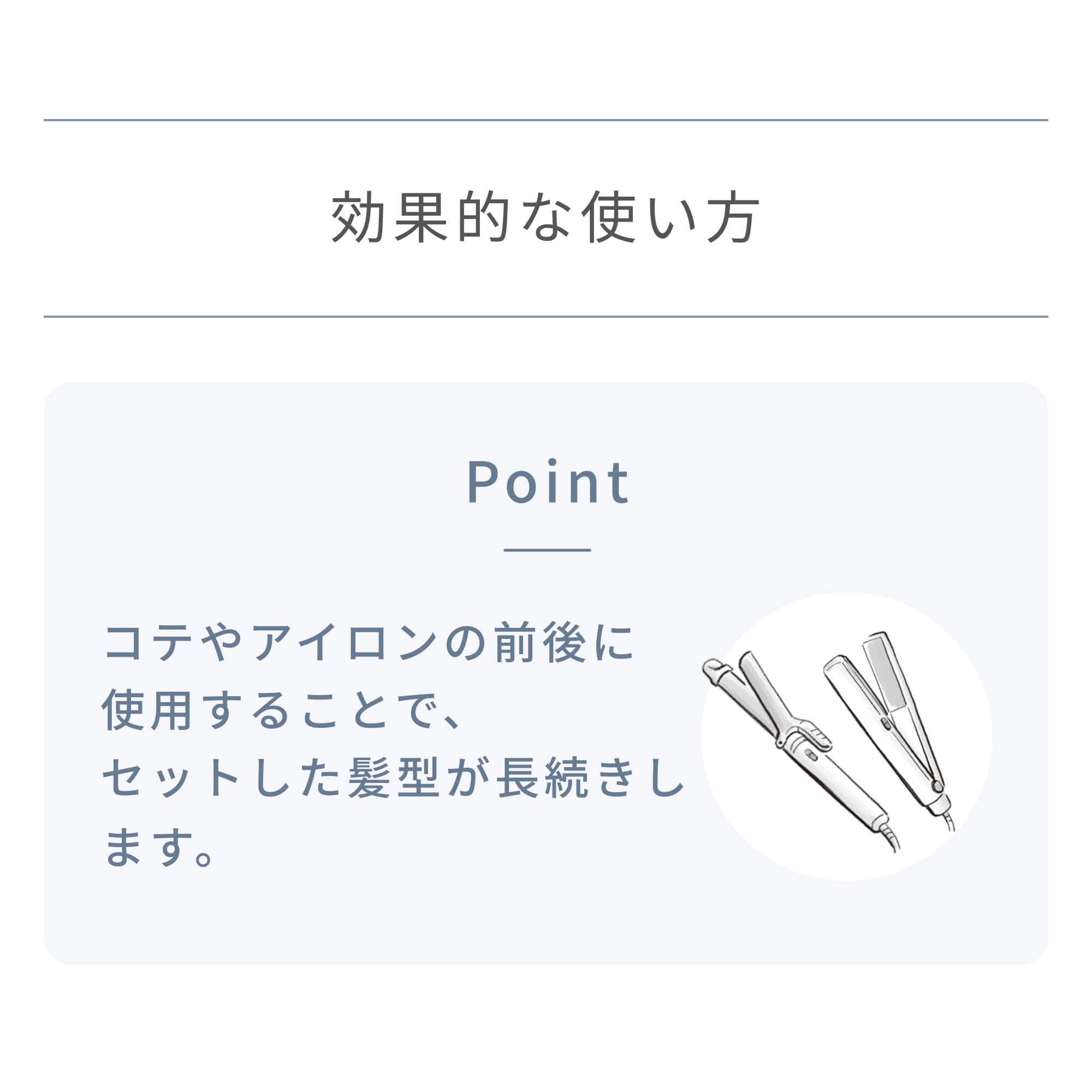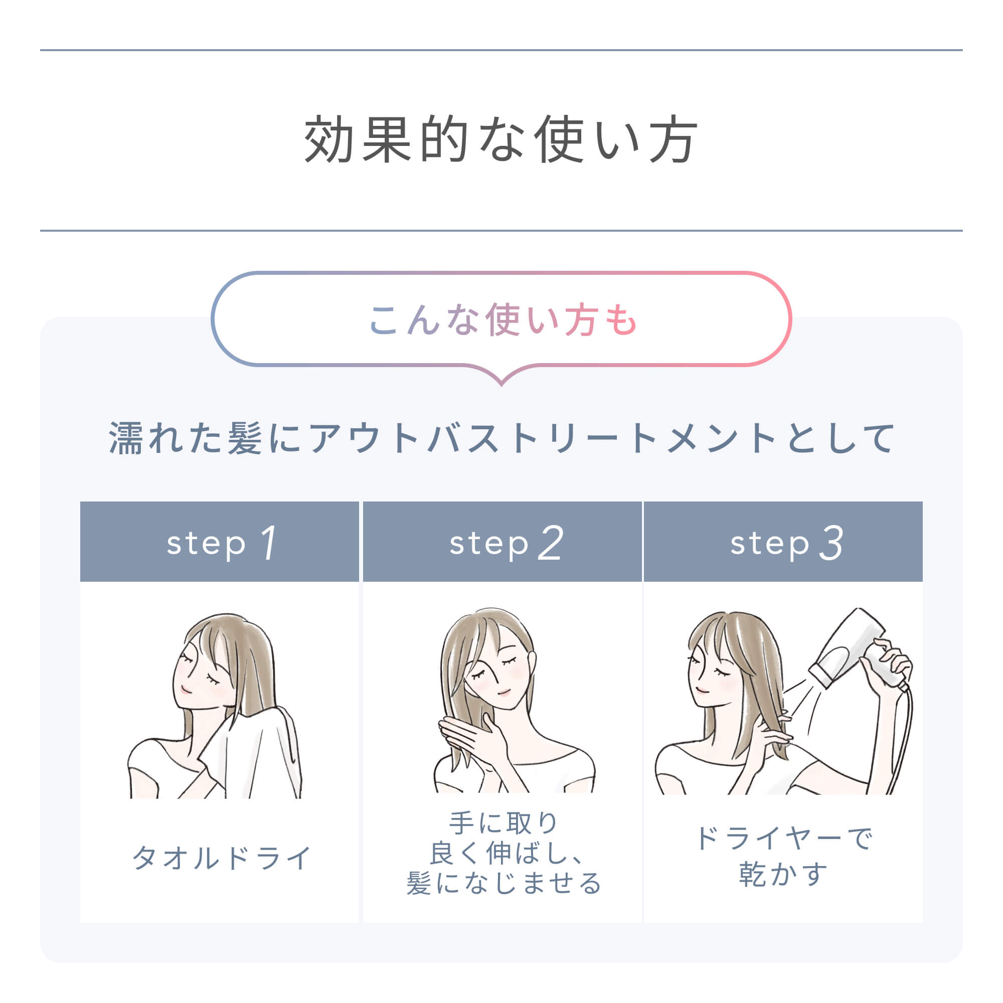 屋外の乾燥した空気や直射日光、摩擦など、私たちのまわりは多くのダメージ要因であふれています。朝でも夜でも、乾いた髪にも濡れた髪にもつかえるから、あらゆるダメージから髪を守ります。
