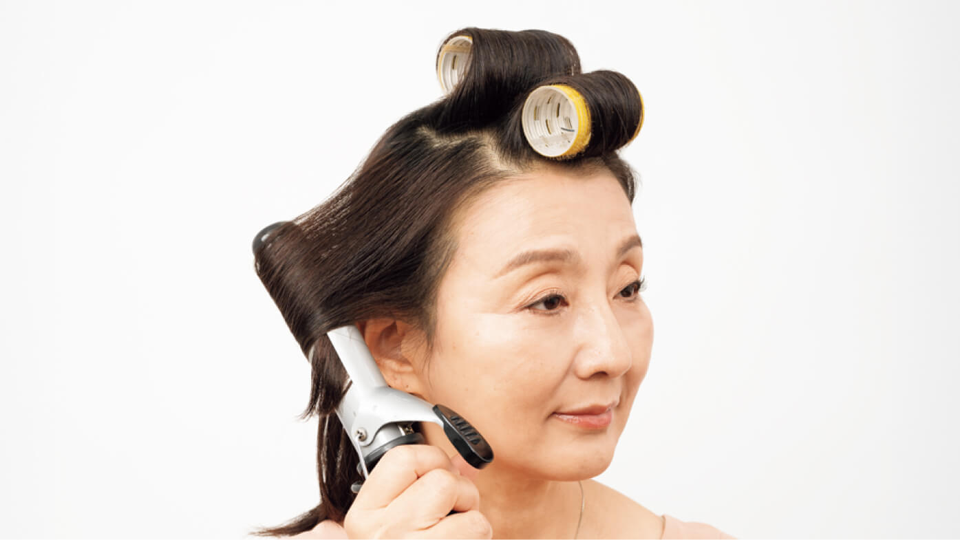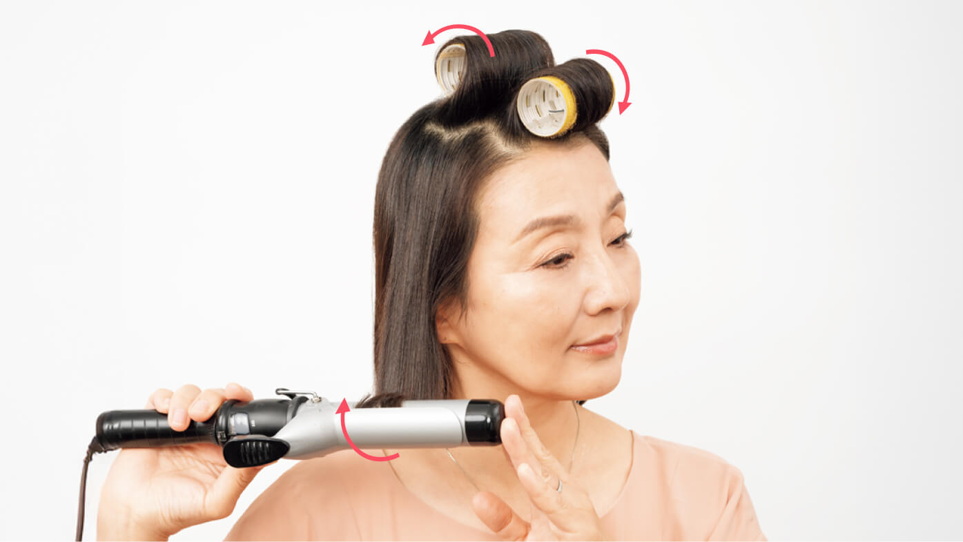 太めのカーラーで、前髪は内向きに。トップは後ろに向かって巻く。