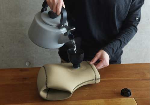 ウェットスーツに使用されるクロロプレンゴムという特殊素材の表面にナイロンジャージを施した生地で作られており、断熱性・保温性・耐久性に優れています。熱の伝わり方が穏やかなため、カバーなしでも低温やけどをしにくい構造になっています。