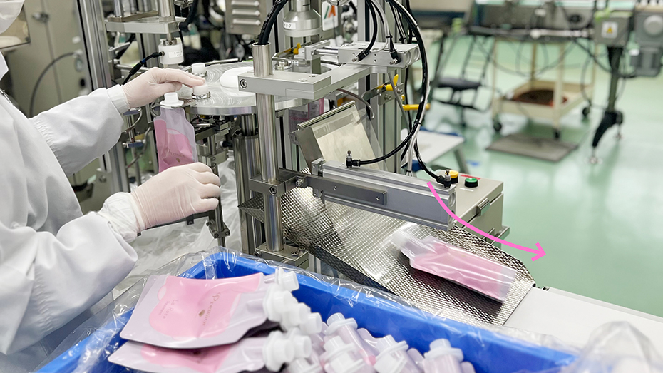 そうですね。今日充填しているのはプレミオール トリートメントです。まず空気を袋の中に吹き込み、同時に吸引し、ほこりがない状態にします。そして1つ1つ詰めるのですが、その工程もスタッフが目視でチェックをしています。