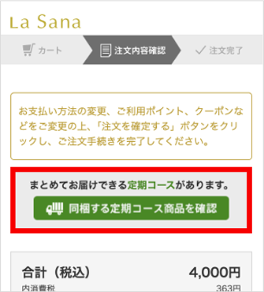 定期便の購入金額を含める場合、定期便と同梱してお届けが必須となります。次回お届けの10日前までに、お電話もしくはラサーナ公式通販サイトからお届け日の変更をお願いいたします。